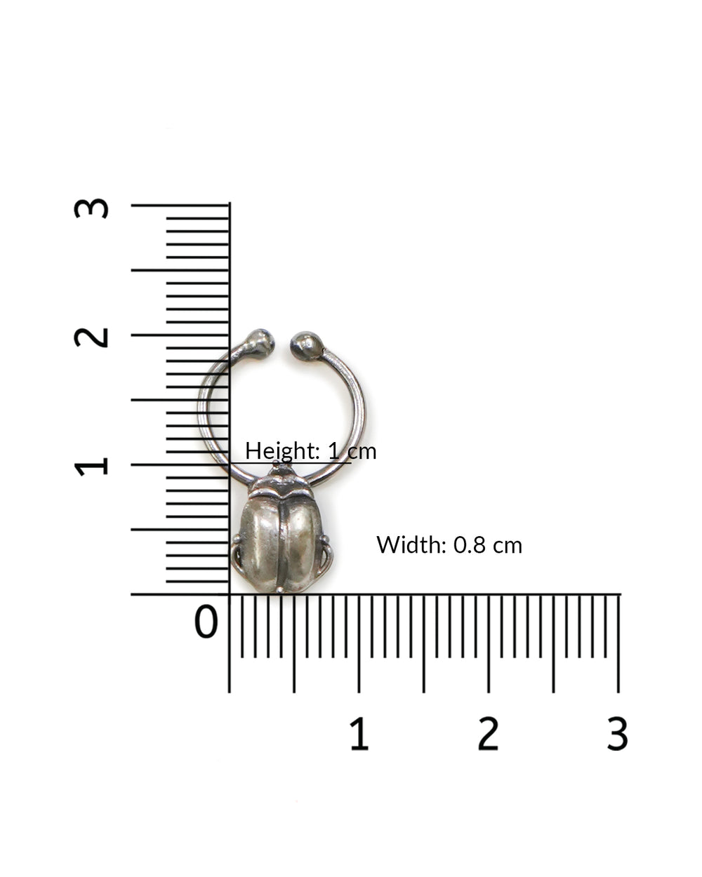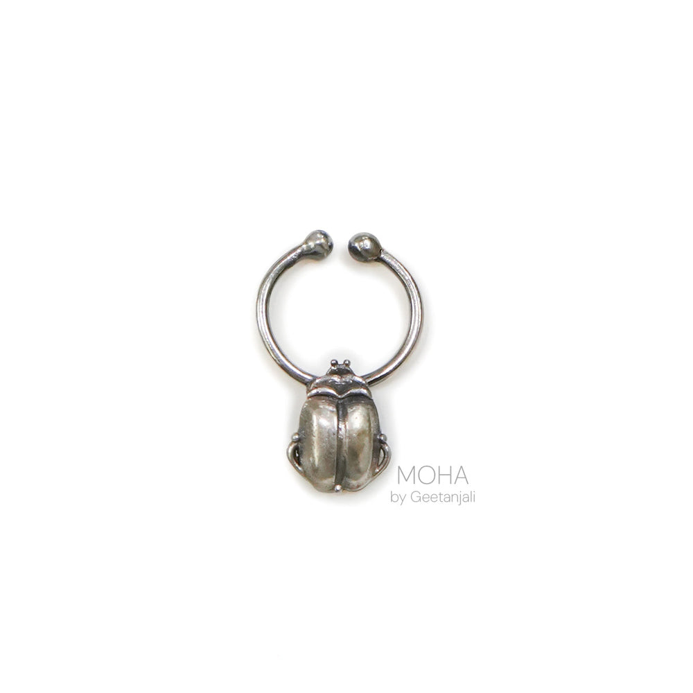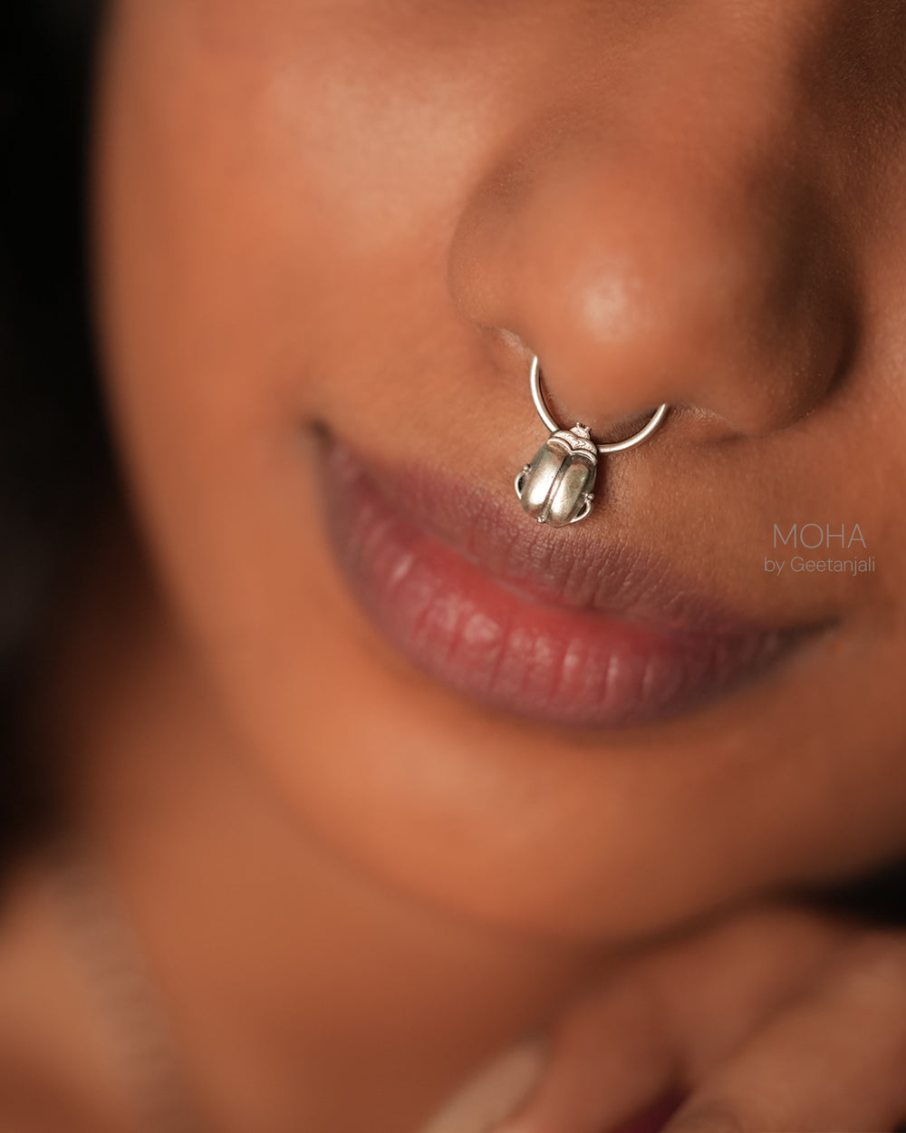Bold yet beautifully balanced, the Beetle Septum draws inspiration from nature’s tiny guardian - the beetle, a symbol of protection, resilience, and quiet strength. Handcrafted in fine silver, this septum features a delicately detailed beetle motif that adds character without overpowering your look. Perfect to style with both ethnic ensembles and modern silhouettes, it’s a piece that celebrates individuality and rooted design.