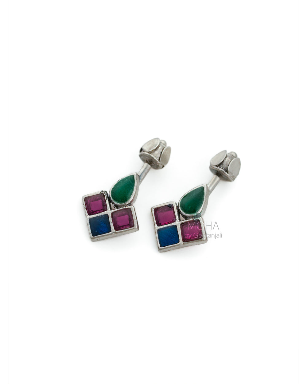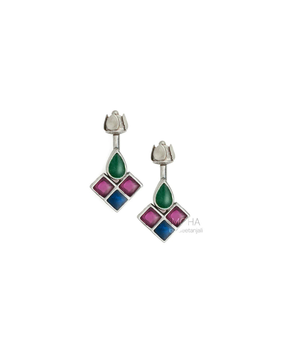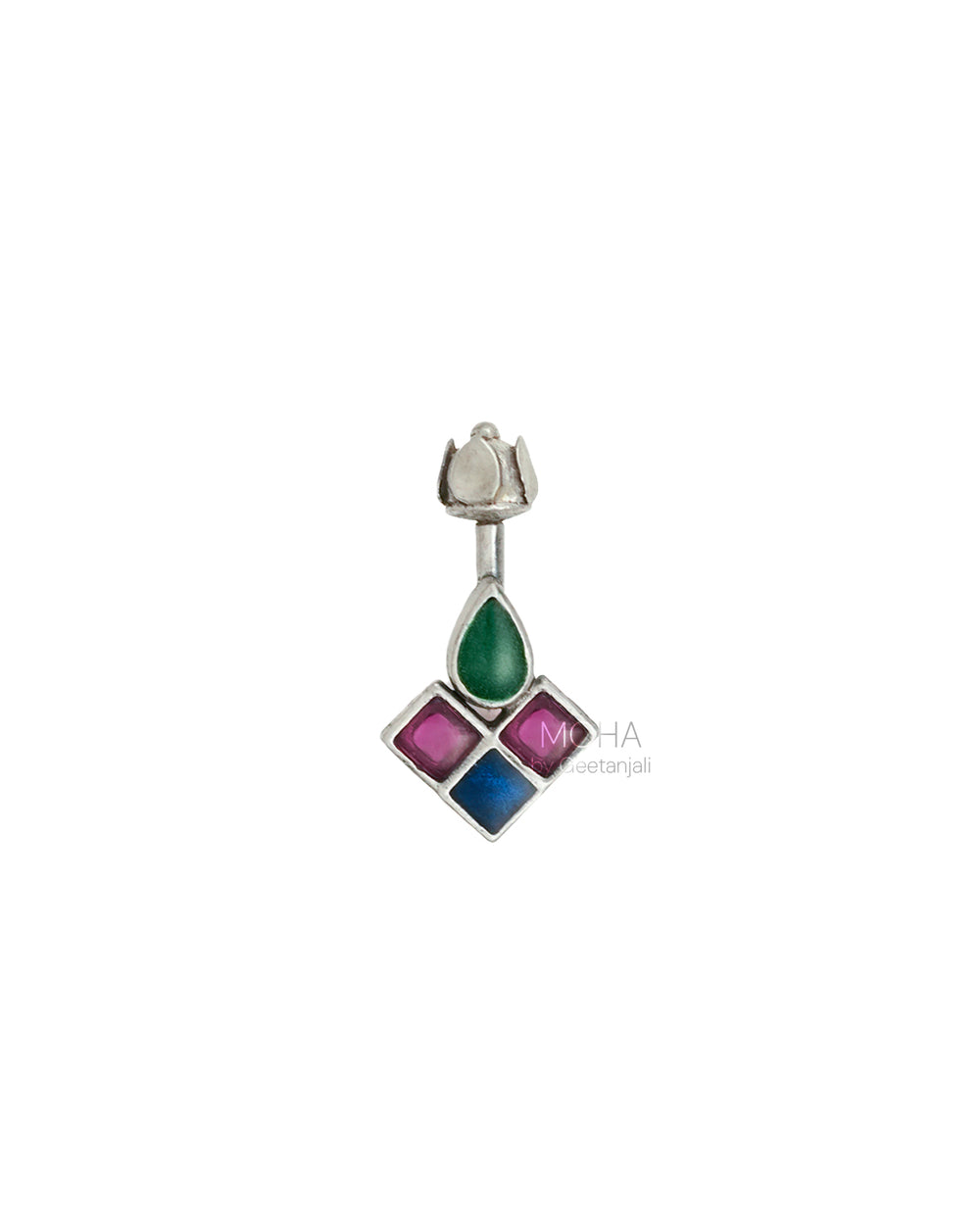 Chakor Silver Bugadi is a captivating fusion of colour and tradition. This silver bugadi shaped as a singular teardrop motif is filled with vibrant green meenakari work, adding a touch of traditional Indian artistry. Flanking it are three captivating squares, each adorned with a dazzling pink stone and blue meenakari.