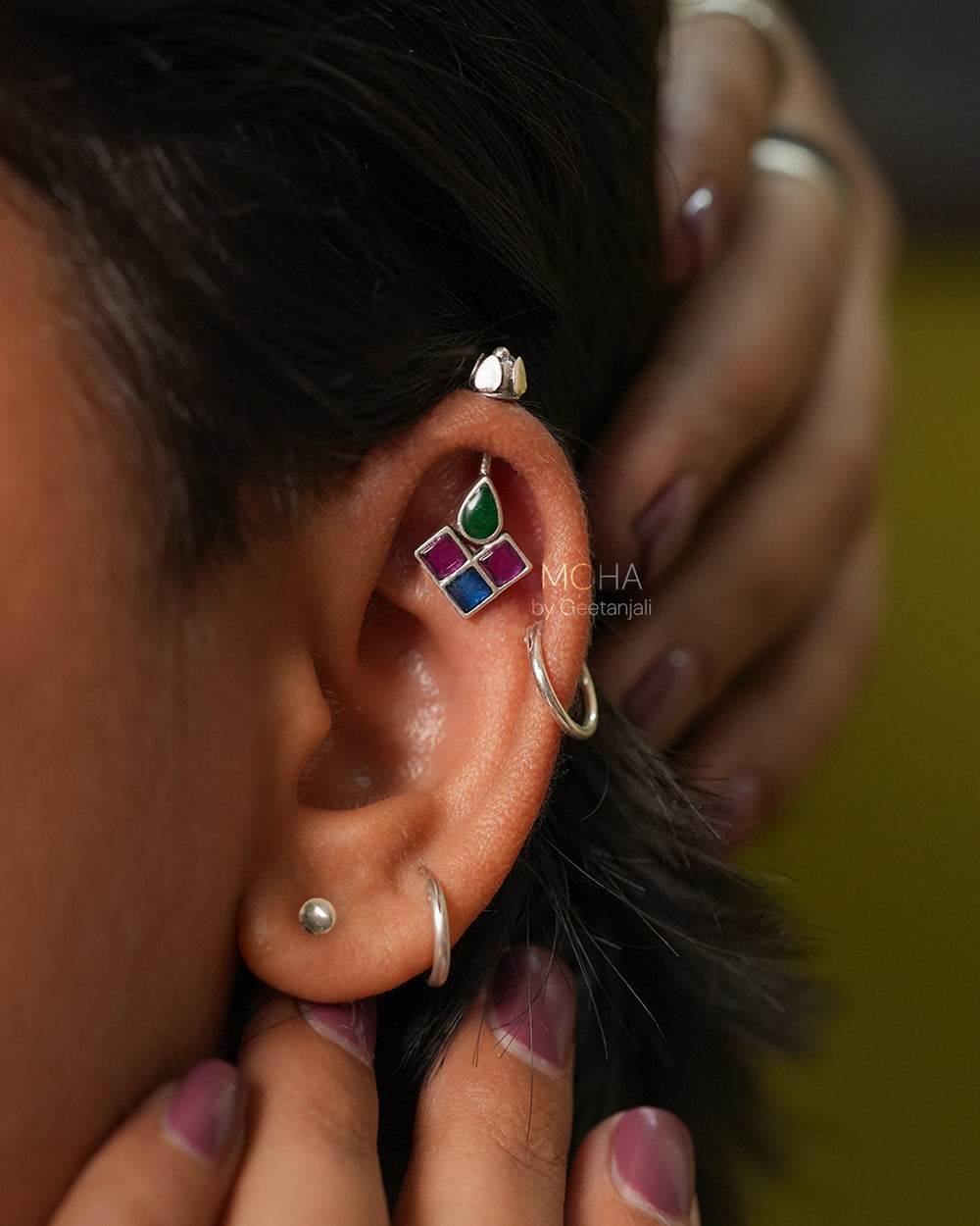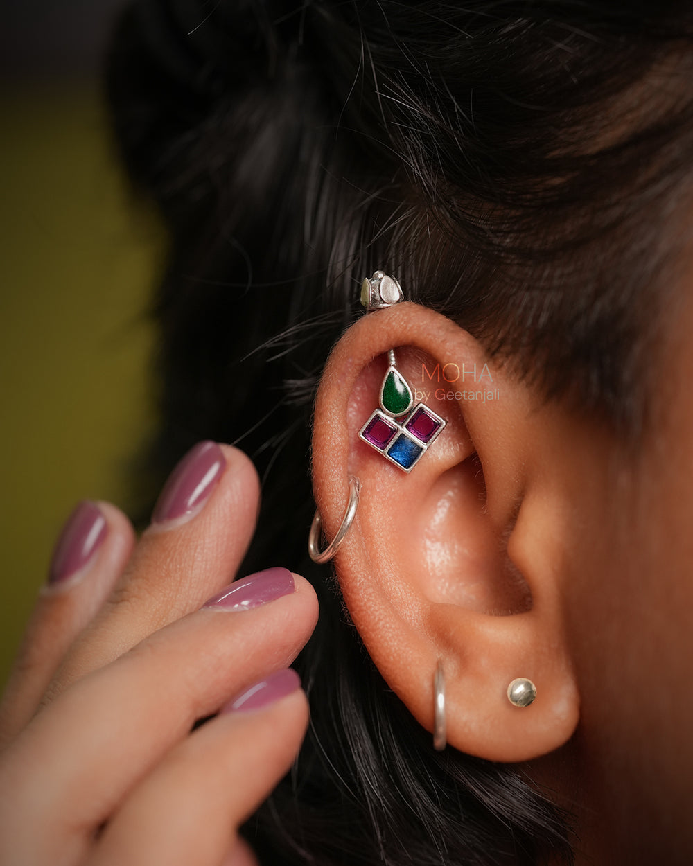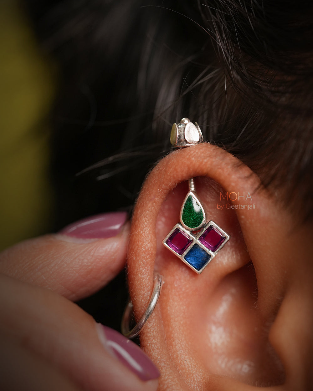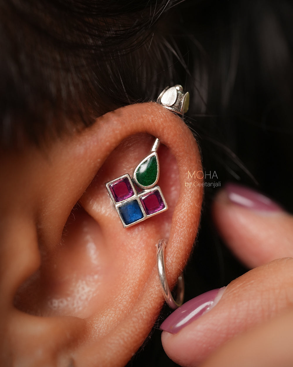 Chakor Silver Bugadi is a captivating fusion of colour and tradition. This silver bugadi shaped as a singular teardrop motif is filled with vibrant green meenakari work, adding a touch of traditional Indian artistry. Flanking it are three captivating squares, each adorned with a dazzling pink stone and blue meenakari.
