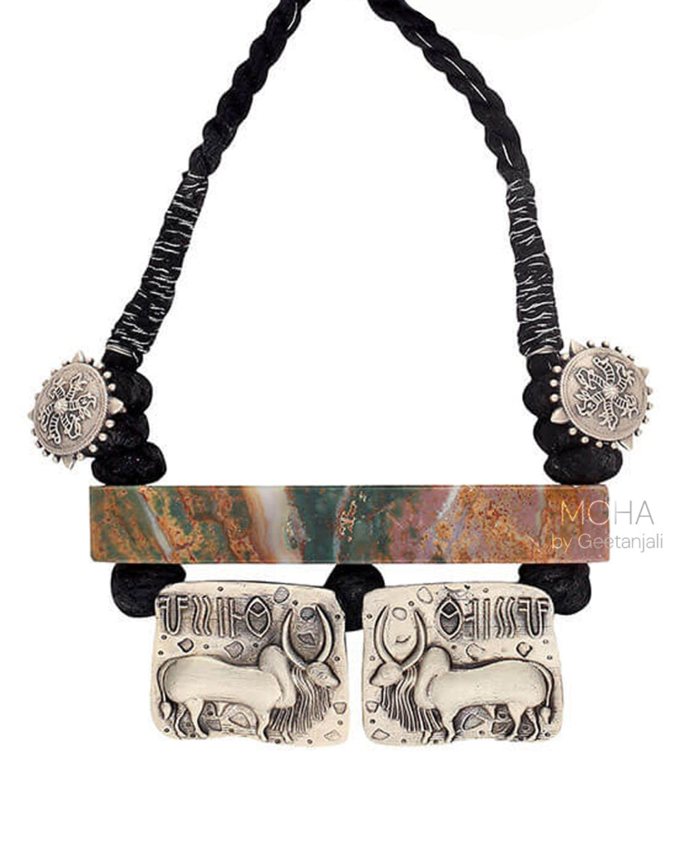 This Harappa Vrishabh necklace from the "Harappa" collection has the iconic Harappan motif of the bull seal on them with rectangular green agate stone, black thread cord and tassel with adjustable string.