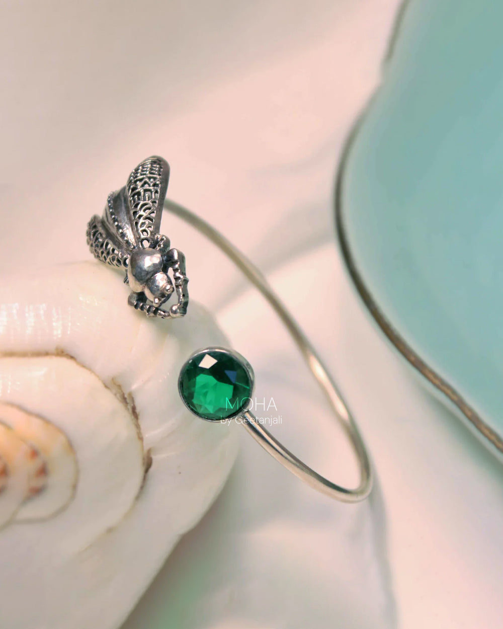 Inspired by the unusual tree crickets, one of our favourite design, to enhance the beauty and give a MOHA touch we have added the green popping stone to this unusually inspired bracelet. This eye-catching bracelet will give an earthy-natural touch to your look.