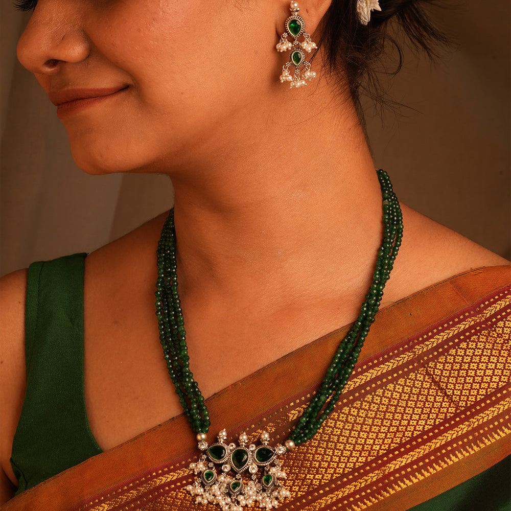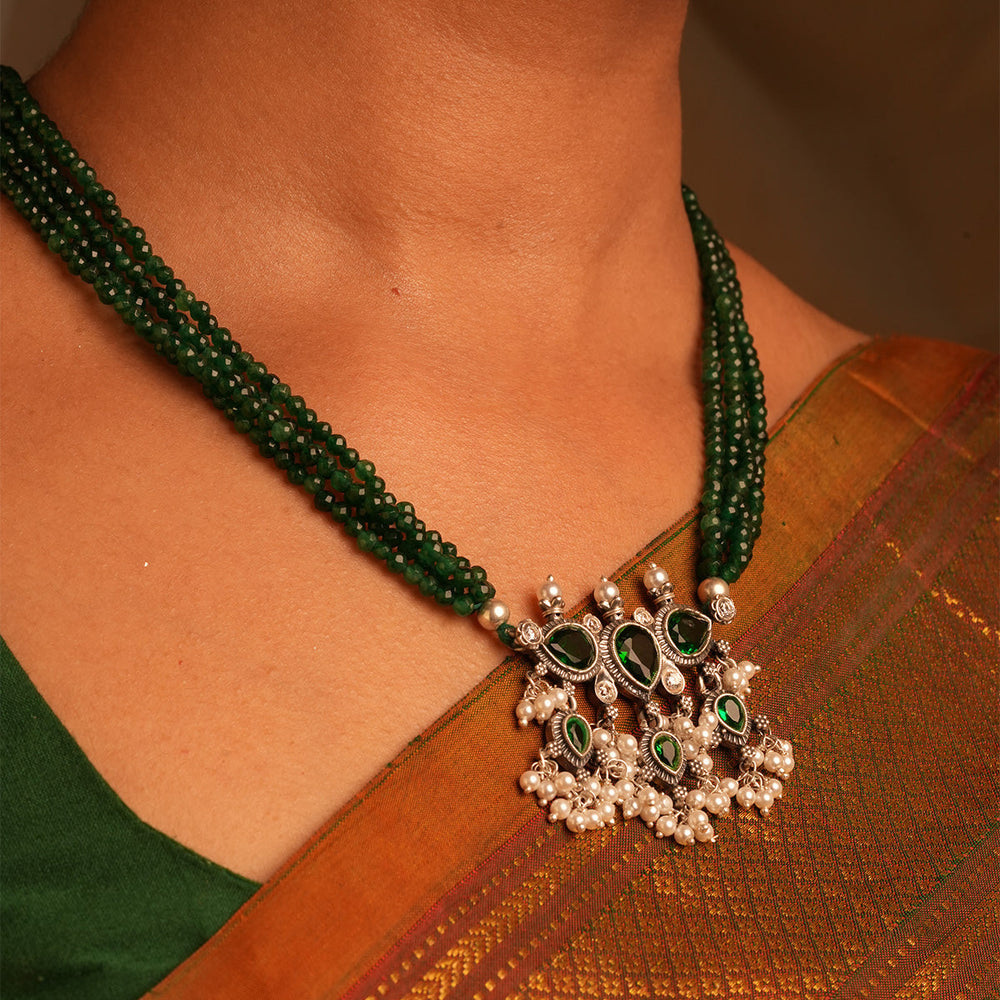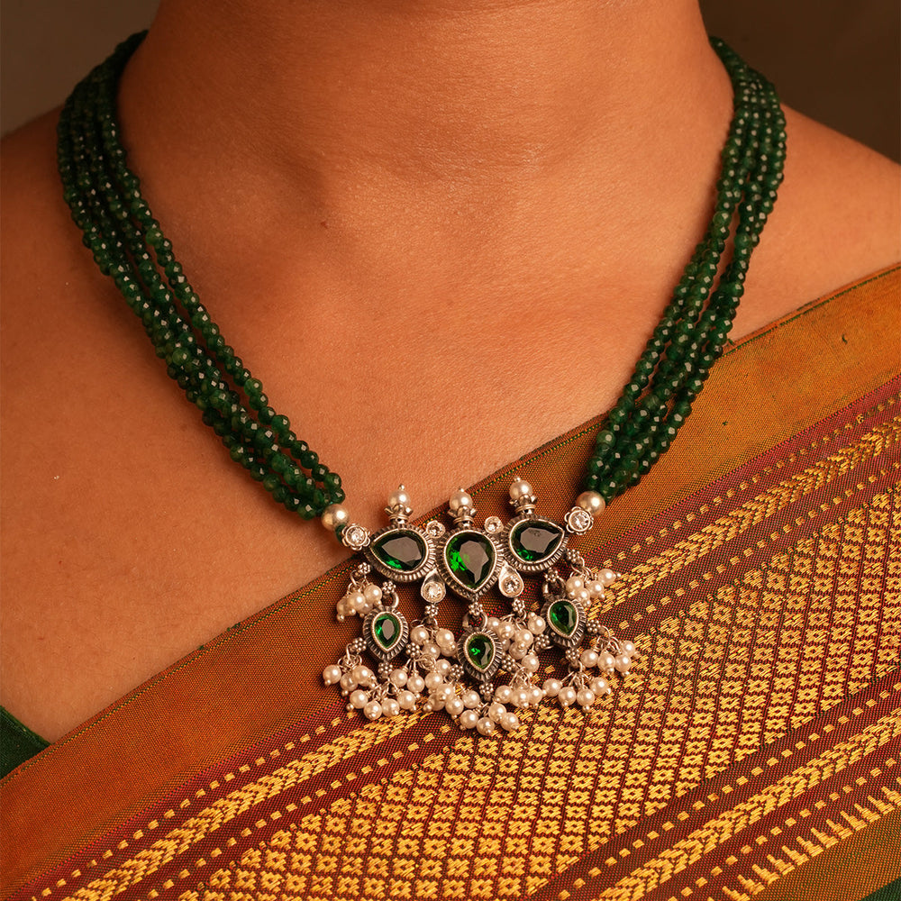 The necklace is made with a Pure silver pendant inspired by a leaf shape with studded stones, together to form a beautiful pendant, along with a real, naturally cultured delicate freshwater pearl woven in a string. This shape and strands or pearls make the Tanmani beauty what it is.