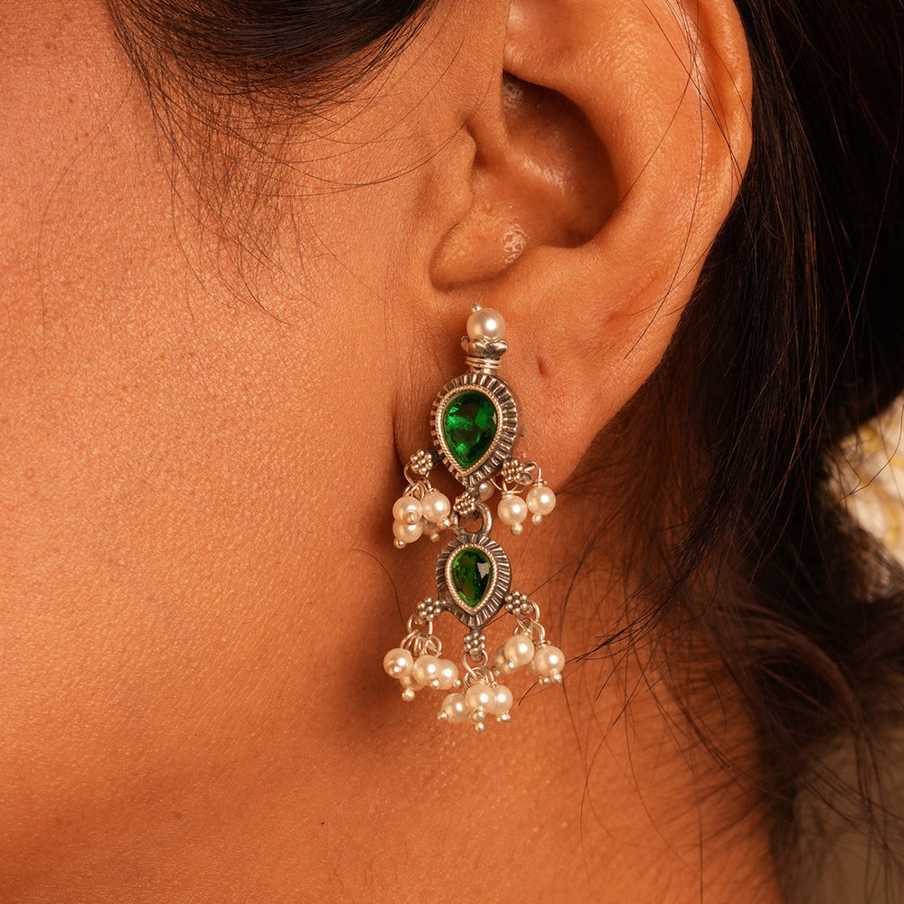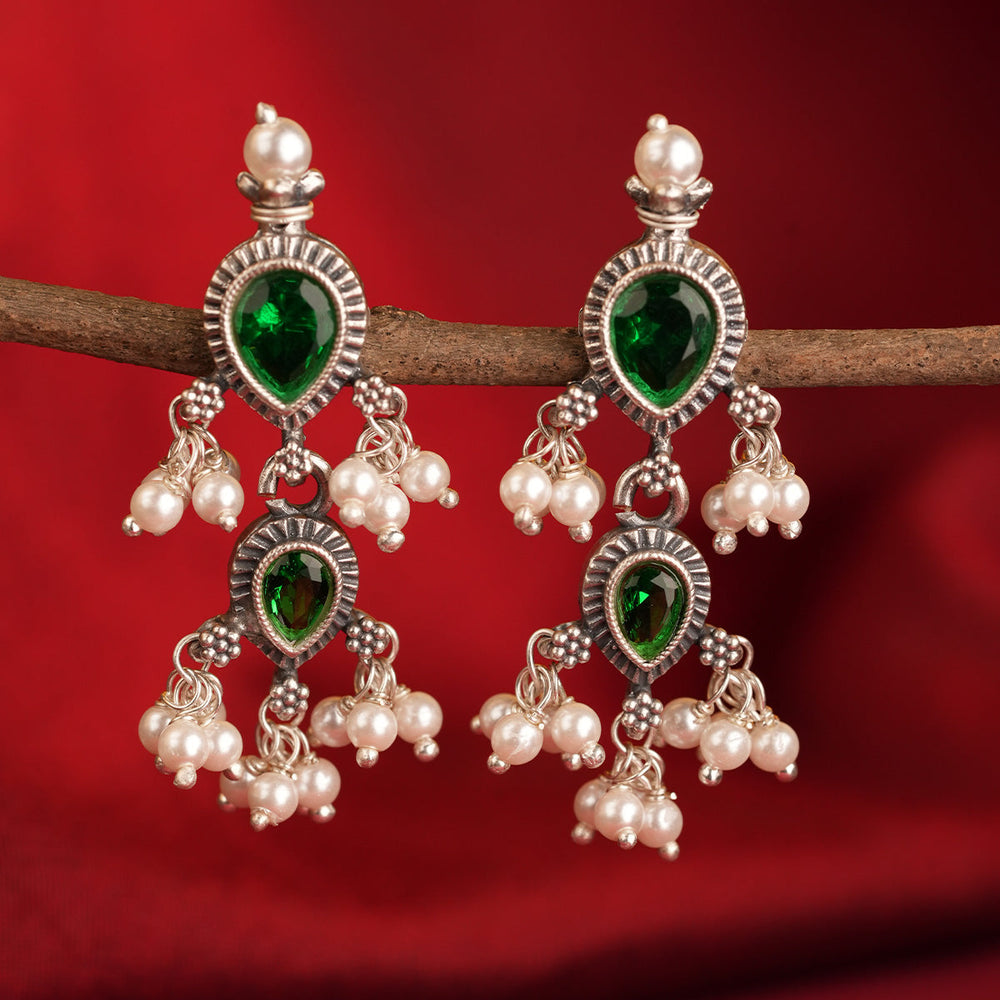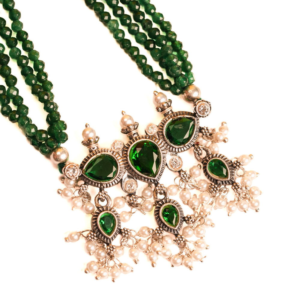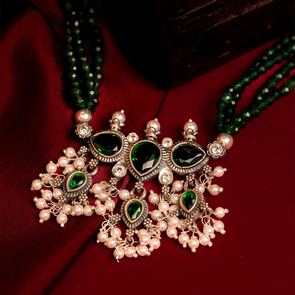 The necklace is made with a Pure silver pendant inspired by a leaf shape with studded stones, together to form a beautiful pendant, along with a real, naturally cultured delicate freshwater pearl woven in a string. This shape and strands or pearls make the Tanmani beauty what it is.