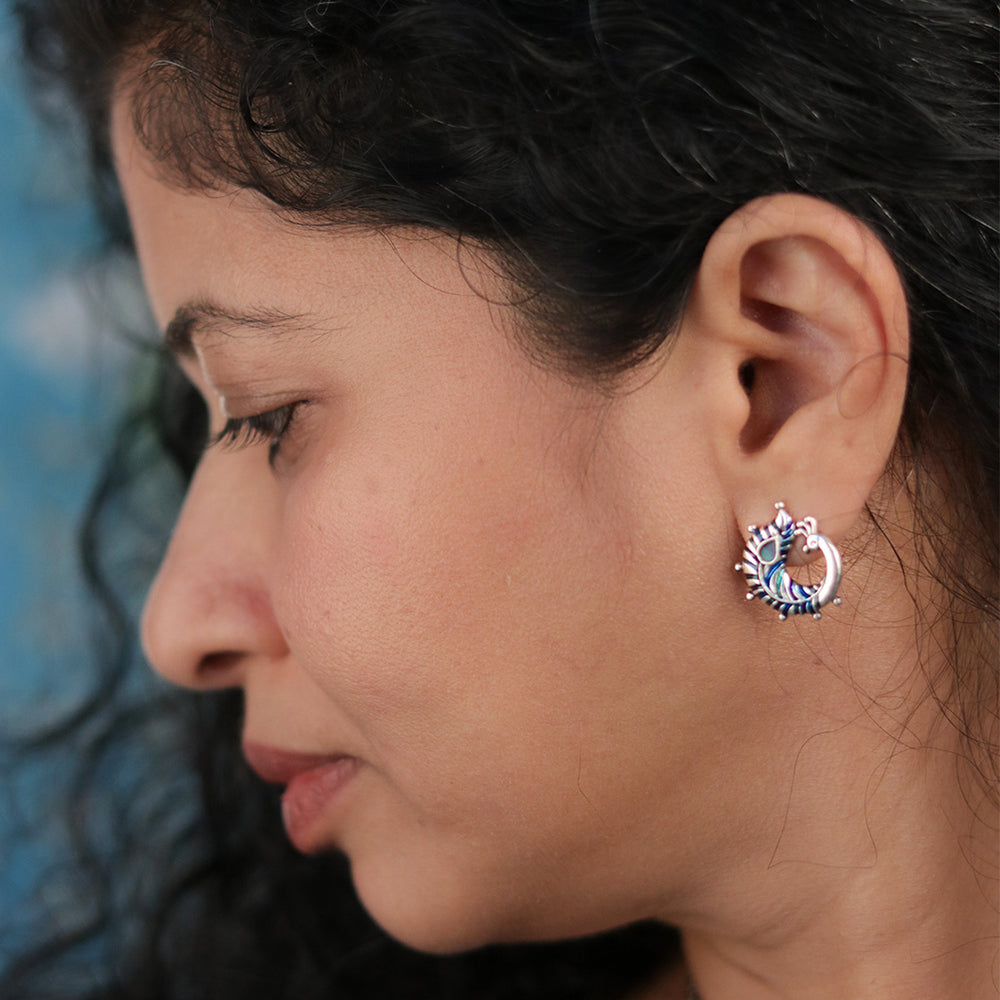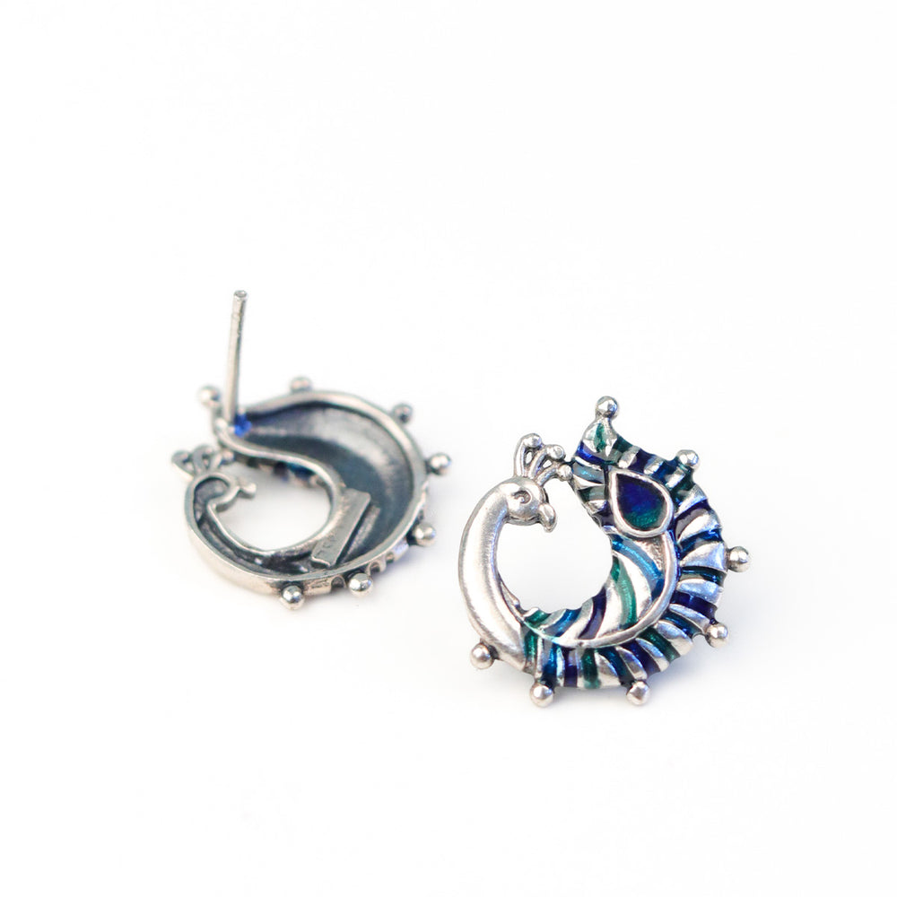 Mayurika Silver Earrings enhanced by a Peacock motif, symbolises renewal and the beauty of nature. Sophisticated yet stylish, its sterling silver earrings capture attention and illuminates ensemble.