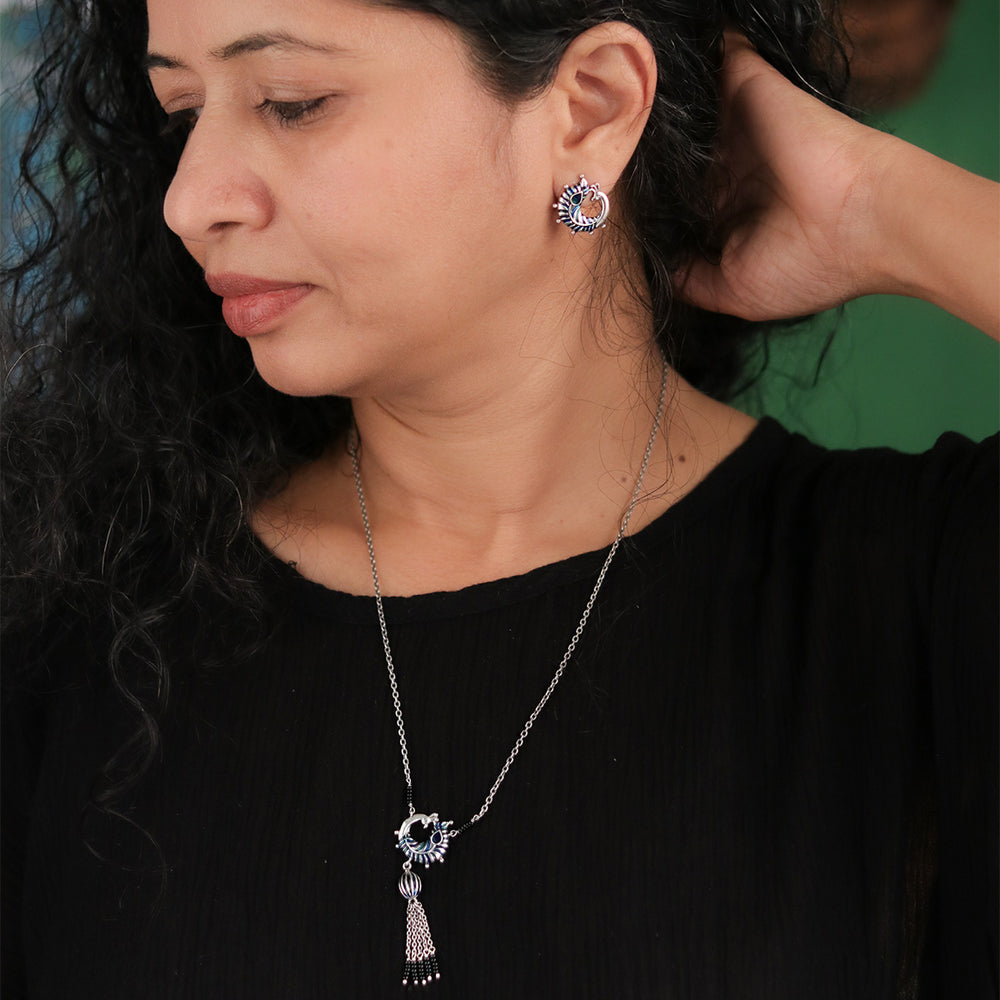 Mayurika Silver Mangalsutra with the peacock design, completes this harmonious look. Effortlessly stylish and comfortable, the Mayurika Mangalsutra Set lets you celebrate tradition with a modern flair. It's the perfect addition to your jewelry collection, ideal for both office wear and casual outings