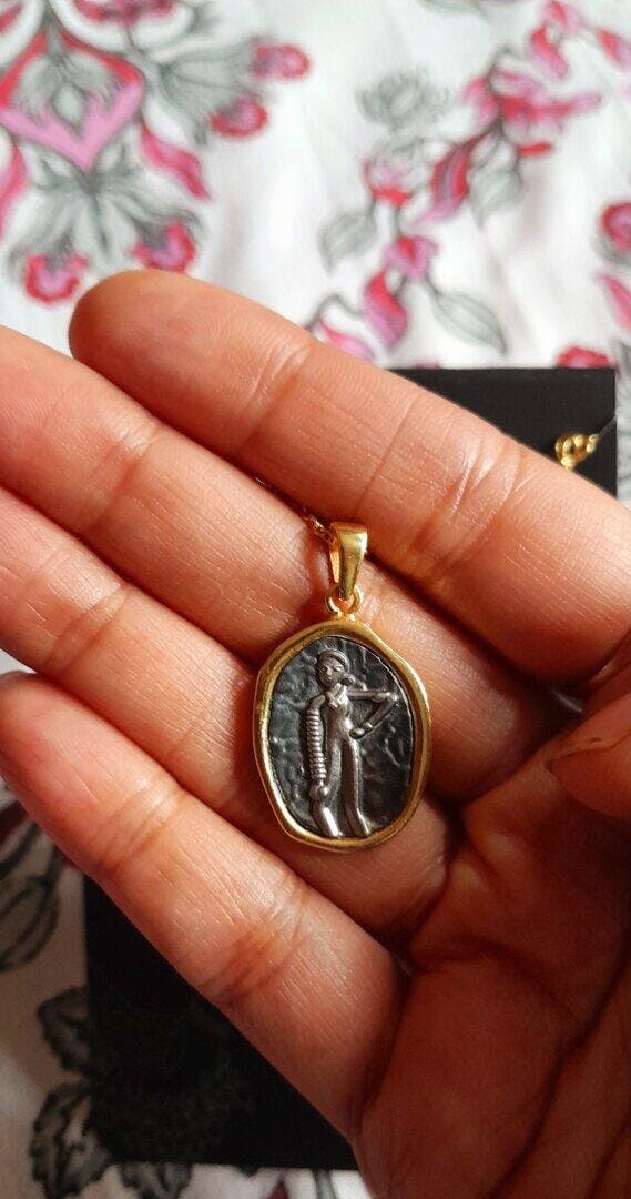 Handcrafted from 92.5 sterling silver, the pendant features a dual finish of oxidation and 22-karat gold plating. This striking contrast reflects the duality of ancient culture and modern aesthetics.