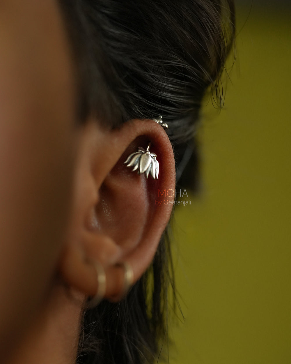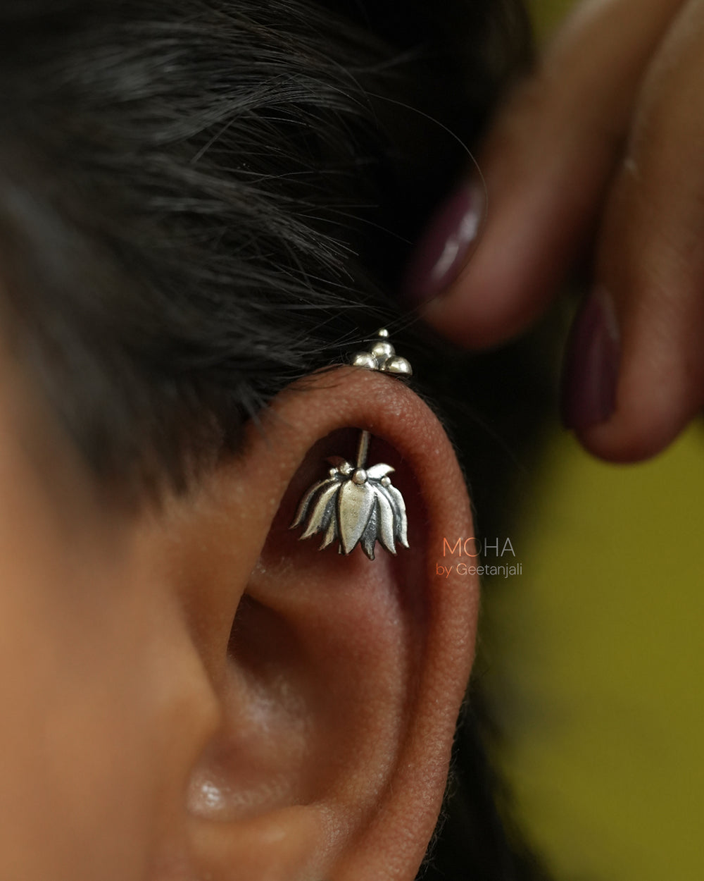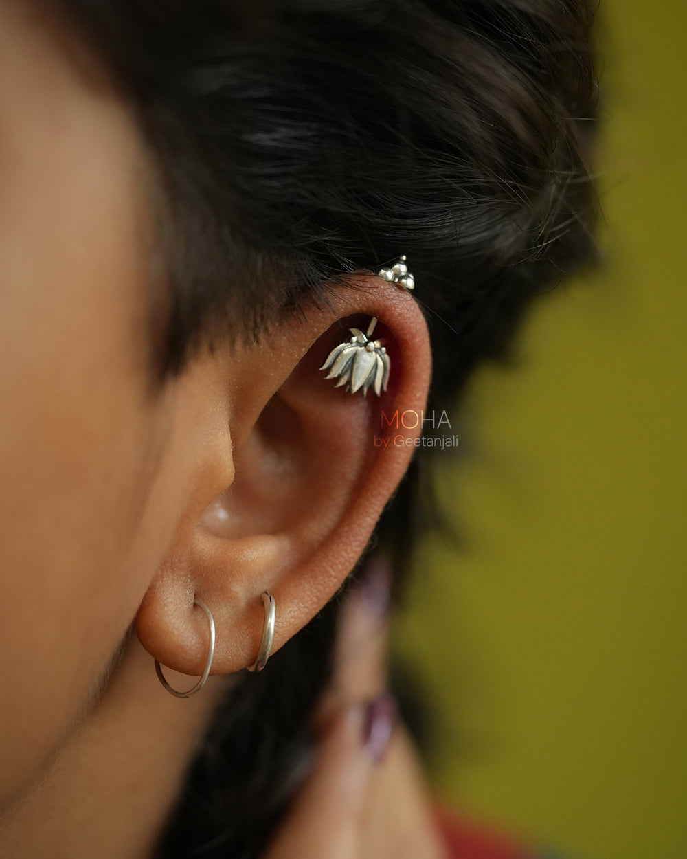 Inspired by the serene beauty of the lotus, this handcrafted Niya silver bugadi captures the essence of grace & purity. Reimagined with Moha's signature touch this bugadi is traditionally worn on the helix of the ear, making it a soulful adornment for both festive and everyday wear.