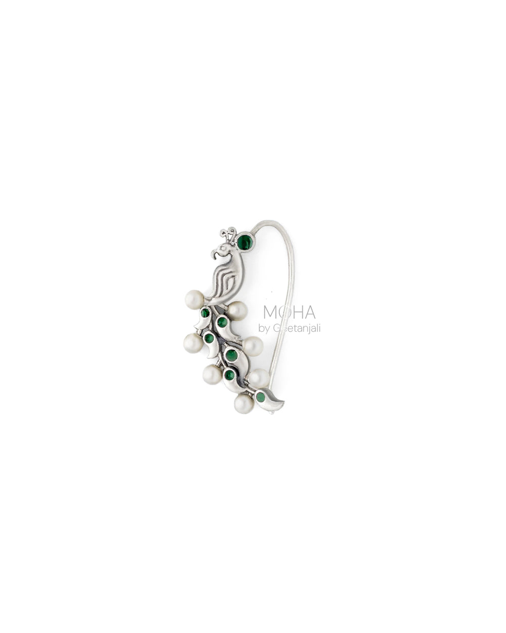 The grace of the peacock is well-known. The addition of the pearls only adds to its allure. For all the beauty and elegance, wear this Mor Moti Silver Nath/Nose ring.