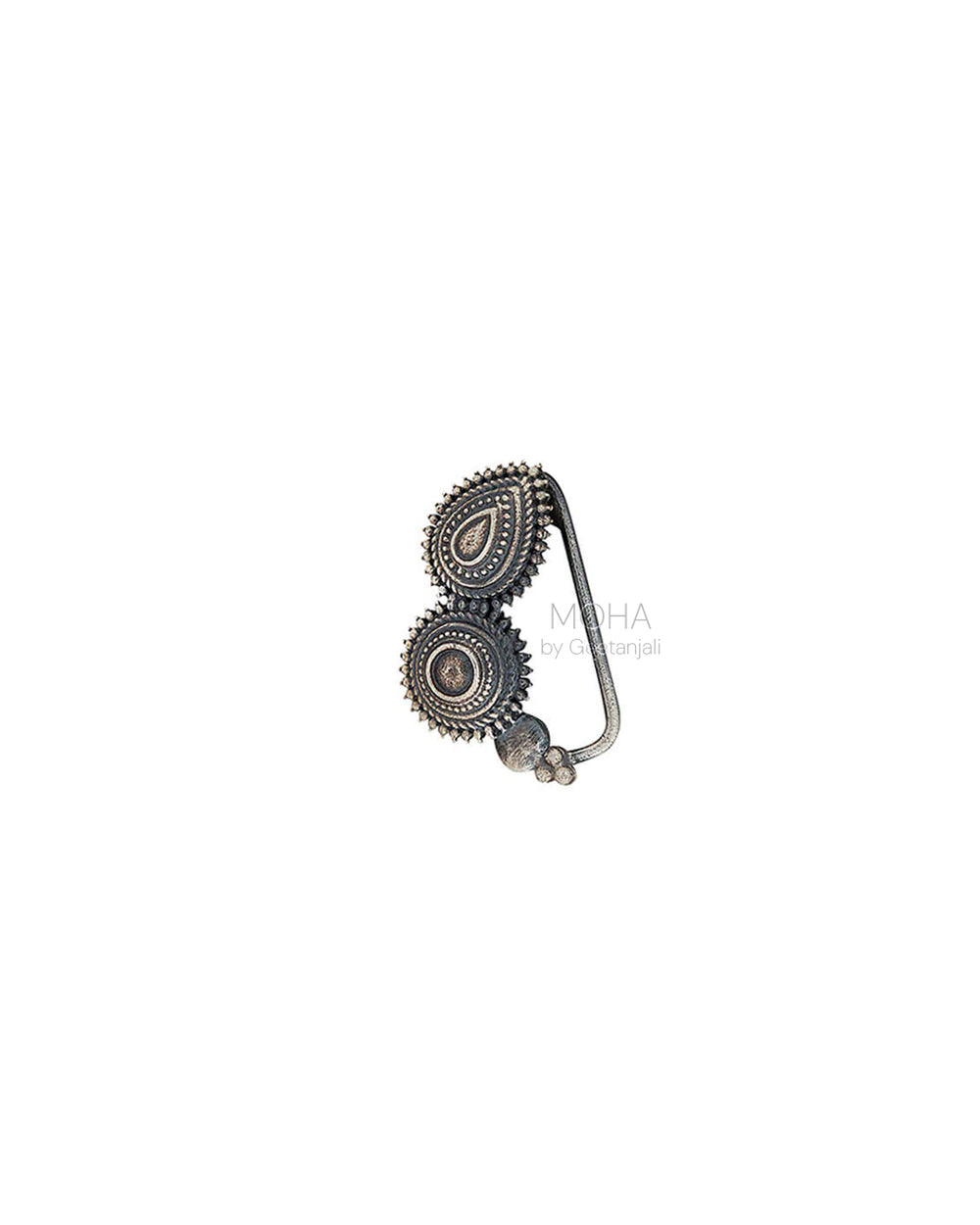 This Nath is a revived version of the traditional Peshwa 'Nath' predominantly seen during the Peshwa period in gold. Moha has handcrafted this traditional piece of silver jewellery with its unique design aesthetics. Just like each and every piece of Moha, it has been tweaked to suit today's lifestyle. It is a great ornament to add a traditional finish to your wardrobe.
