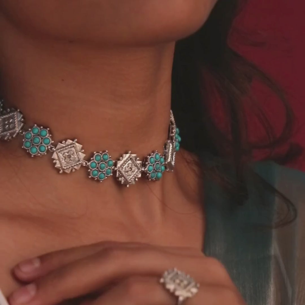 RatnaShakha Silver Necklace is one of Moha's exquisite Necklace which is inspired by the captivating window styles of the Kadamba dynasty, each piece in this collection encapsulates the essence of ancient Indian craftsmanship. The use of Turquoise beads create a blend of history and artistry that you can wear and cherish, reminding you of the beauty of the past while staying in vogue in the present.