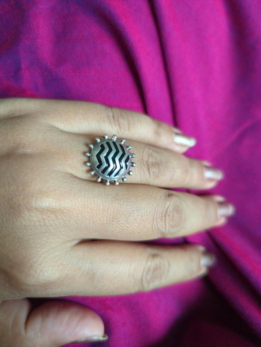 Ravi Silver Finger Ring, a radiant piece that captures the essence of the sun's brilliance. Crafted from sterling silver and adorned with intricate meenakari detailing, this ring is a stunning tribute to the celestial beauty of the sun.
