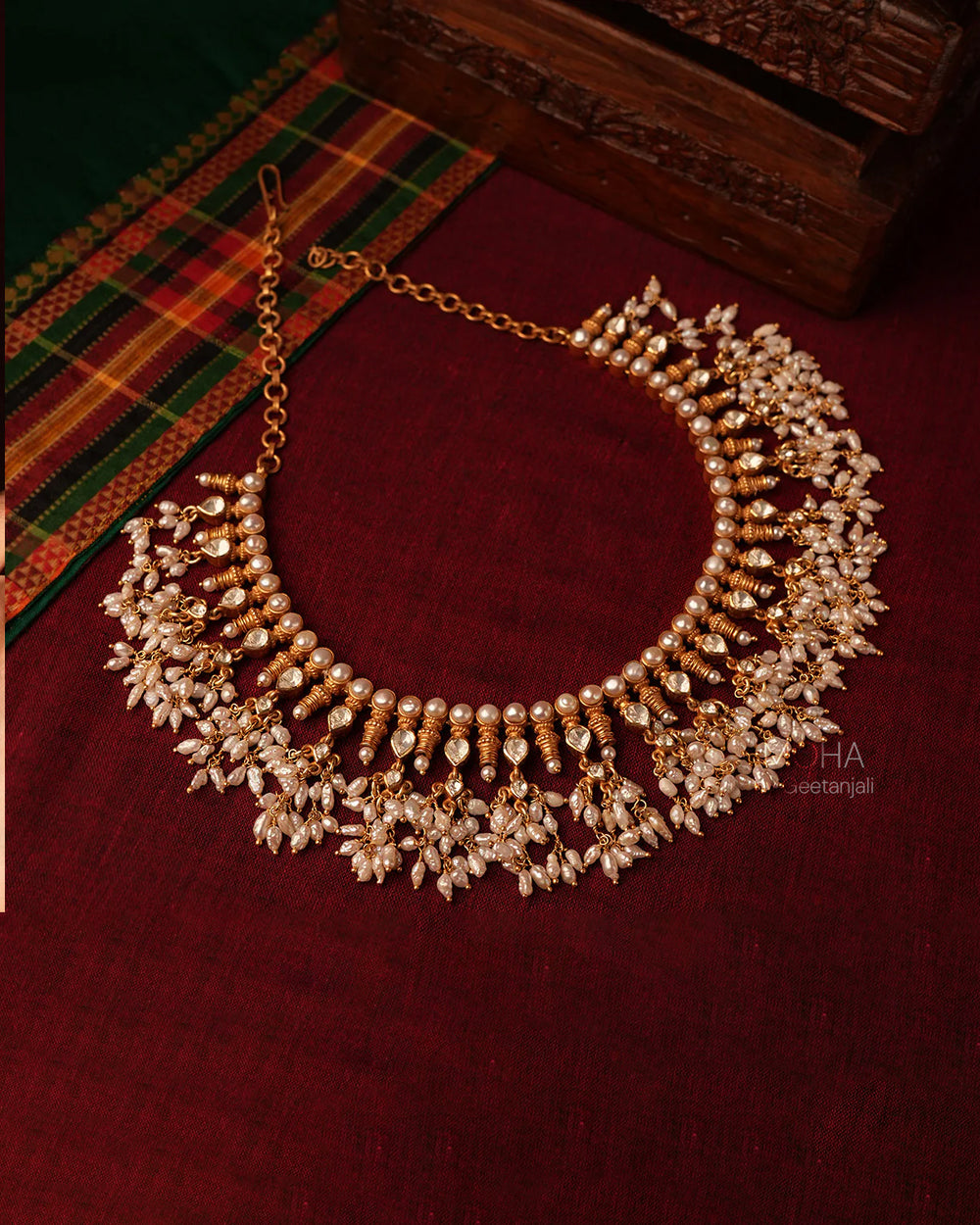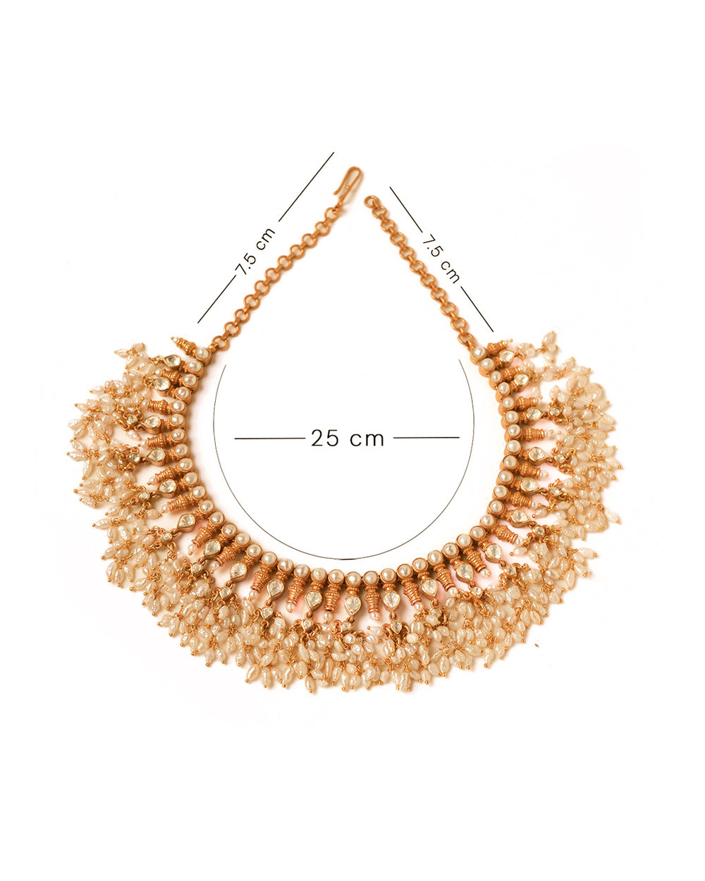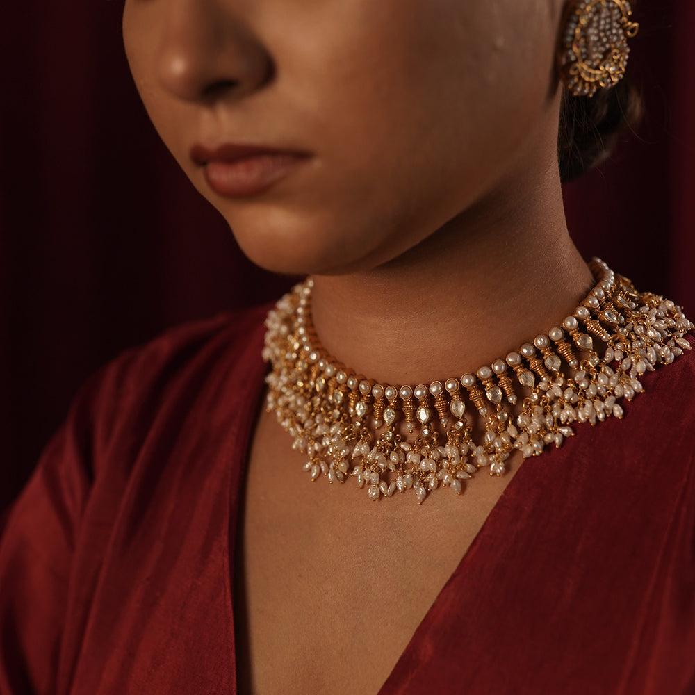 The Rudrani Pearl Necklace is designed to make a bold statement. Its heavy weight and opulent design make it perfect for festive occasions, weddings, or any event where you want to stand out. The combination of shimmering moissanite stones and lustrous baroque pearls creates a dazzling display of light and color that is sure to captivate all who behold it.