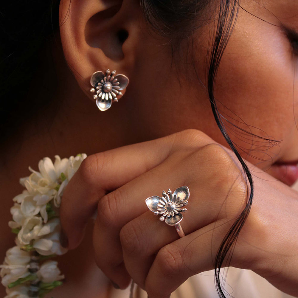 Introducing Triloki Silver Stud earrings from our enchanting "Gulistaan" series, where elegance meets nature's timeless beauty. Crafted with utmost precision and adorned with three delicate petals, this stunning ring is a true ode to the grace and charm of blooming flowers.